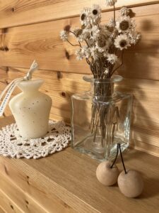 こちらも雑貨屋さんで購入したガラスのフラワーベースにドライフラワー。
