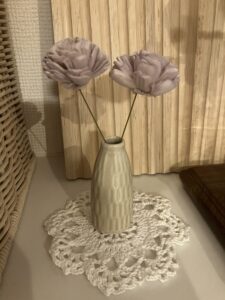 造花、雑貨屋の花瓶、レースのお着物、後ろにはスリーコインズの板